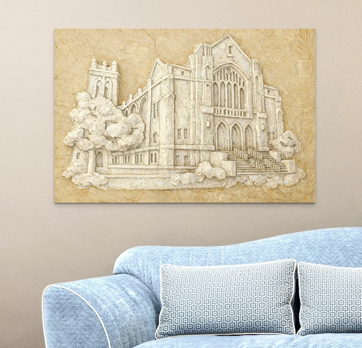 Your project begins with a completely handcrafted large scale original relief work, from which smaller mementos will be created. First Presbyterian Church of Baton Rouge, 33”x44”, 2026