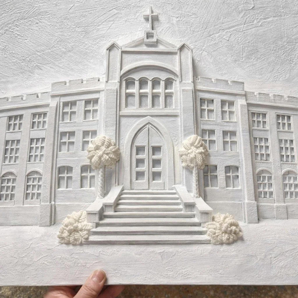 Creating the original relief work from photographs and reference documents begins with a three dimensional original artwork.This subject is the administration building on the Xavier University New Orleans campus.